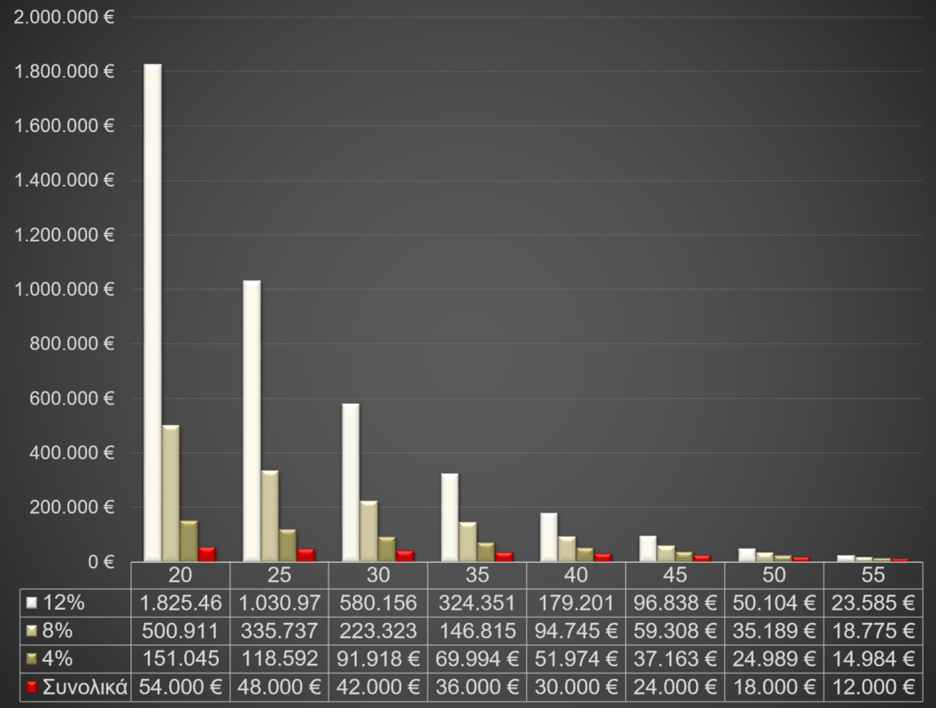 Το γράφημα συγκρίνει το συνολικό καταβληθέν ποσό με την αξία λογαριασμού με την υποτιθέμενη απόδοση (4%, 8% και 12%) της επενδυτικής επιλογής.