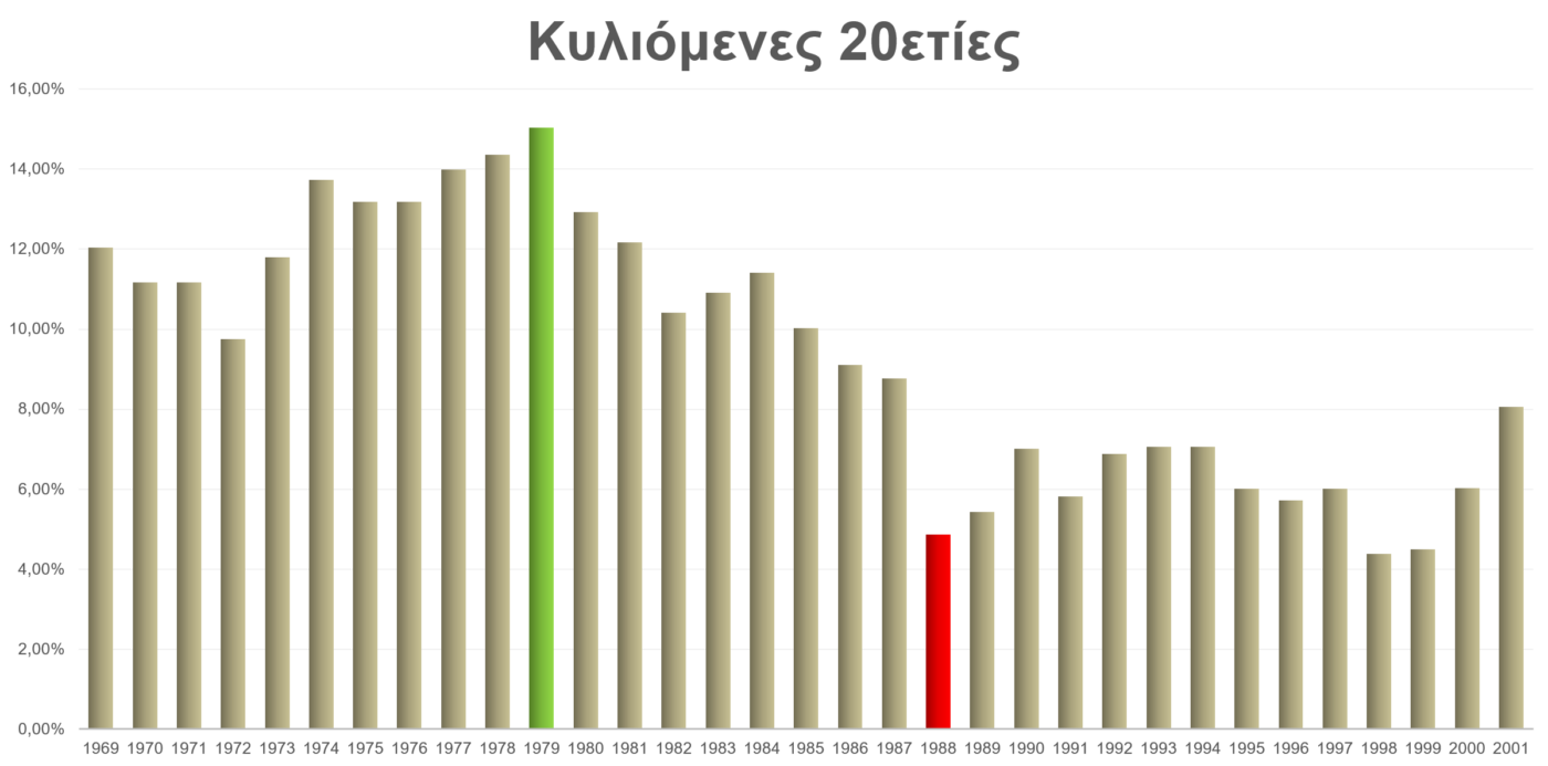 Το παραπάνω διάγραμμα δείχνει την ετησιοποιημένη απόδοση που θα είχε κάποιος που επένδυε στον ίδιο δείκτη με αυτόν της ιστορίας, για κάθε μία 20ετία από το 1969 μέχρι και το 2001.