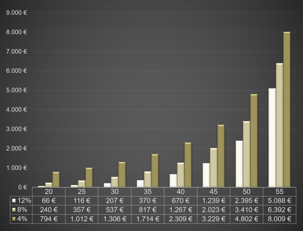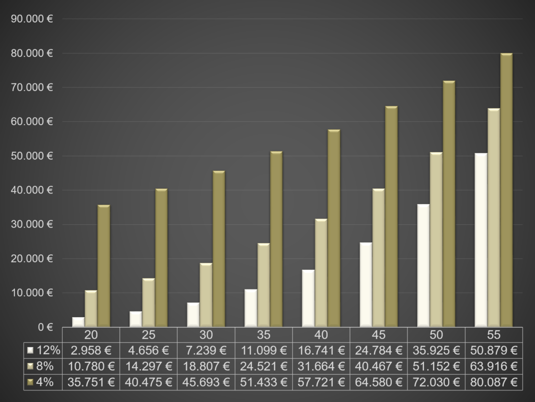 Το γράφημα δείχνει το ετήσιο ποσό αποταμίευσης που απαιτείται για τη συγκέντρωση 100.000€ στην ηλικία των 65 με διαφορετική ηλικία έναρξης.